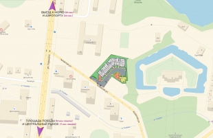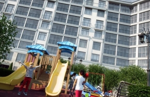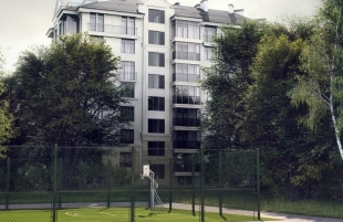 Огороженная территория с детской и спортивной площадками и автостоянкой.